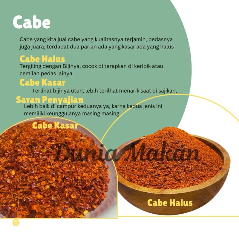 Cabai Kasar Kualitas 1kg adalah cabai bubuk berkualitas yang berbahan cabai murni berkualitas. Dengan rasa pedas yang sangat khas, cukup gunakan sesuai selera